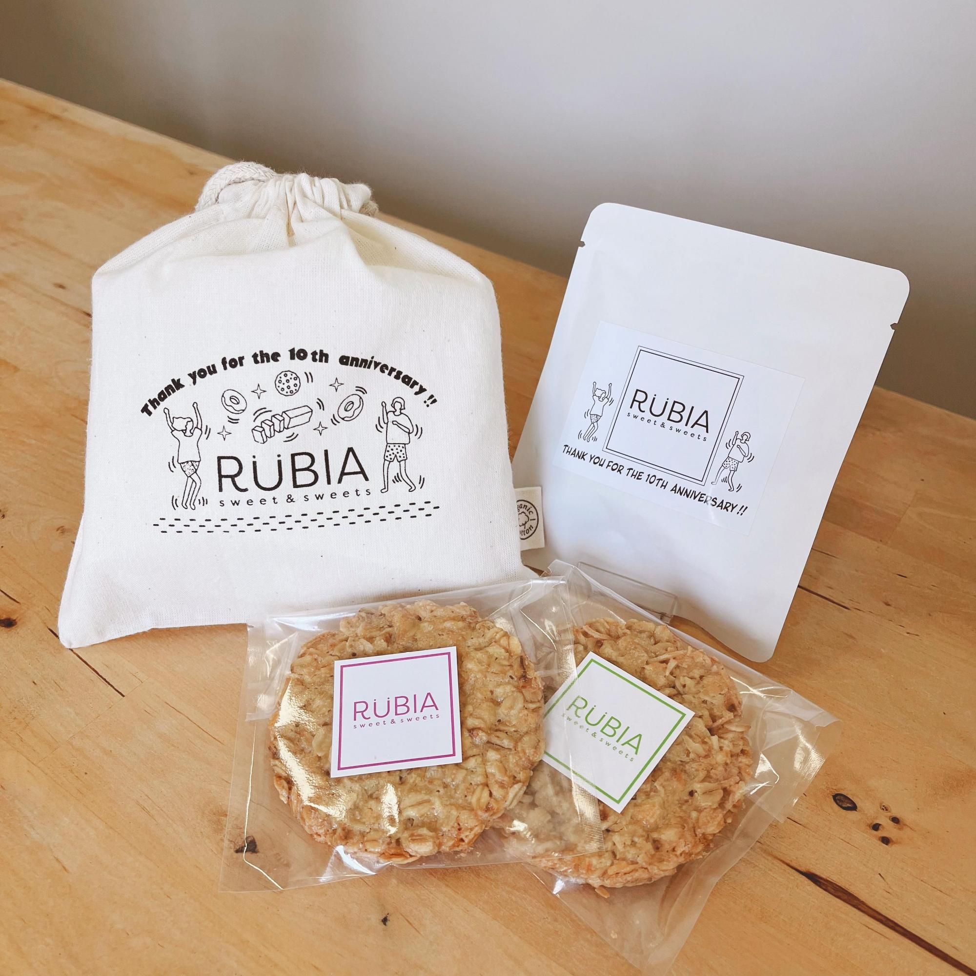 2025年RUBIA10周年記念のオリジナルポーチに、《オートミールクッキー》・テイクアウトコーヒーでお馴染み猫実珈琲店さんの《猫実ブレンド》のコーヒーバッグをセットにしたプチギフトです。